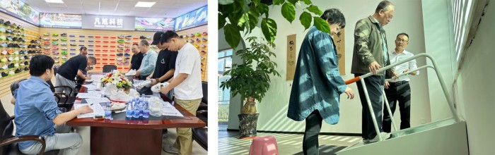 4.智能化车间技术赋能:走进莆田知行合一公司的智能化车间,团队现场讲授“电脑针车”CAM辅助连续模式,促进生产向智能化与自动化方向发展,提高成品标准化程度。同时,详细讲解自动化印线机的智能喷射、热消失油墨、水印线均匀清晰等技术要点,为企业智能化生产提供了坚实的技术支持。
